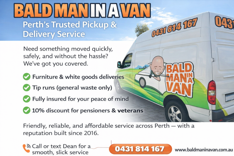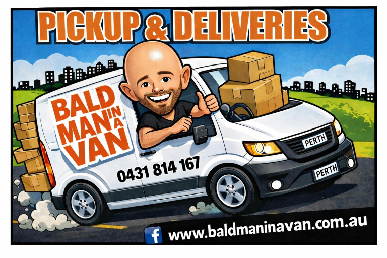 Founded in 2016 Bald man in a van provides quality and affordable pickup and delivery services to residential and commercial customers in the Perth area from Mandurah to Fremantle only! Any pickup 15km outside the rockingham area travel fee applies unless im in that area